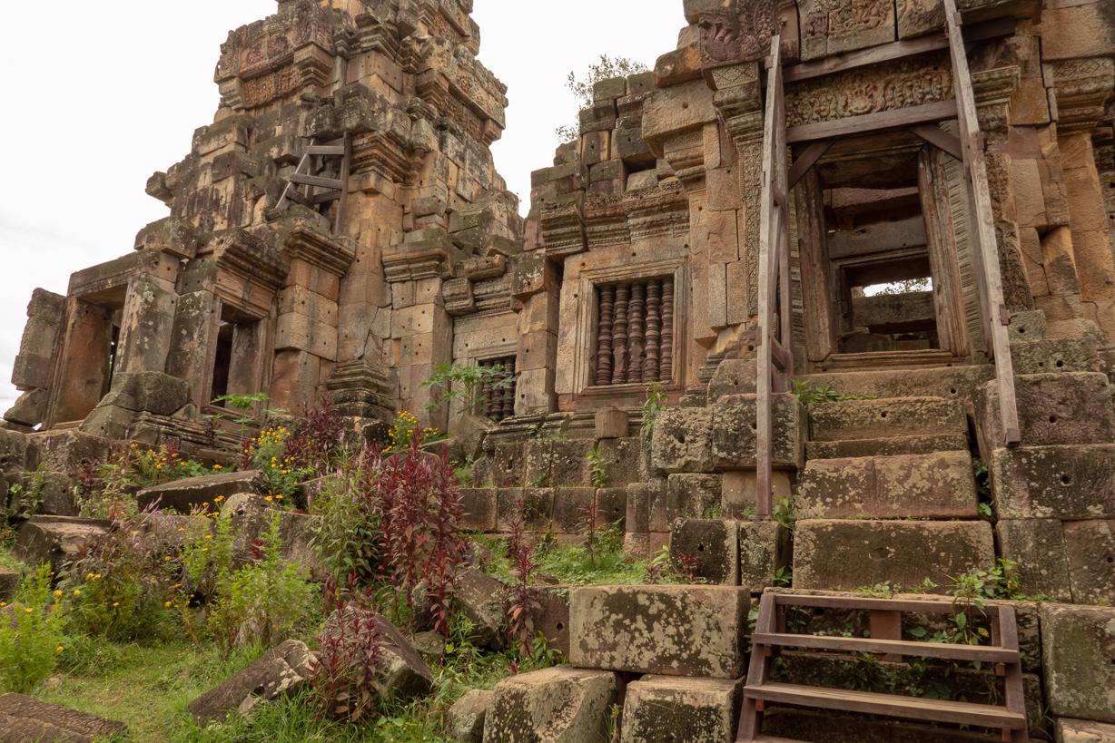 Once you reach the top, you’ll see the temple is made up of 5 towers, constructed of sandstone and laterite. Unfortunately, much of the beautiful artwork and carvings have been destroyed by looters and you’ll notice many of the deities have lost their heads.
