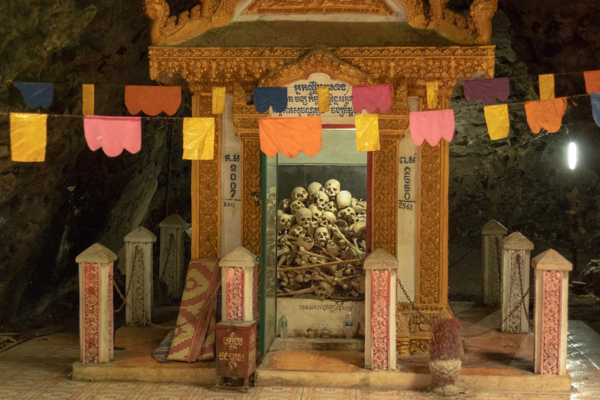 Half way up the mountain is a cave that was used by the Khmer Rouge to discard of the bodies or victims of their genocide. Near the entrance of the cave there is a large reclining buddha as well as a glass walled box containing the bones and skulls of some victims. You can go down into the cave where you’ll see yet more bones. When we were there there was no lighting, so it was pitch black. Make sure you have a phone or some sort of torch.
